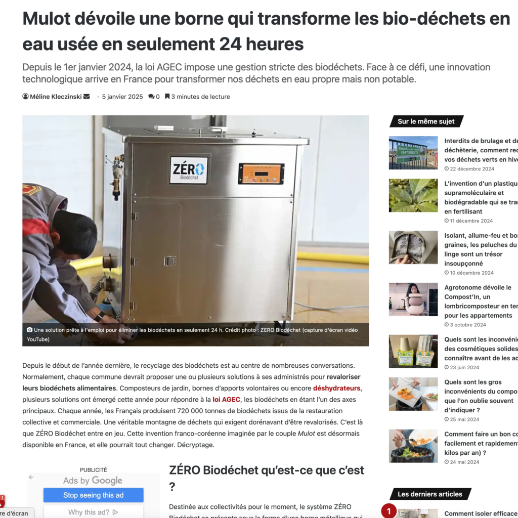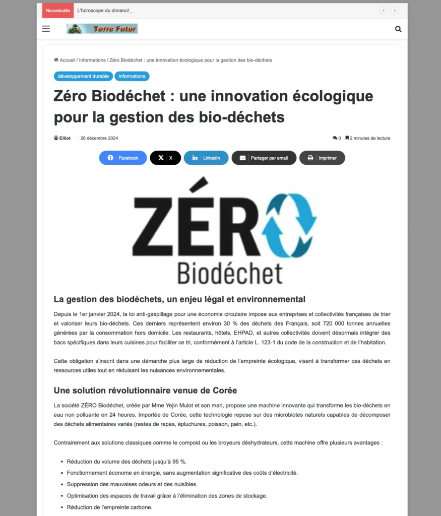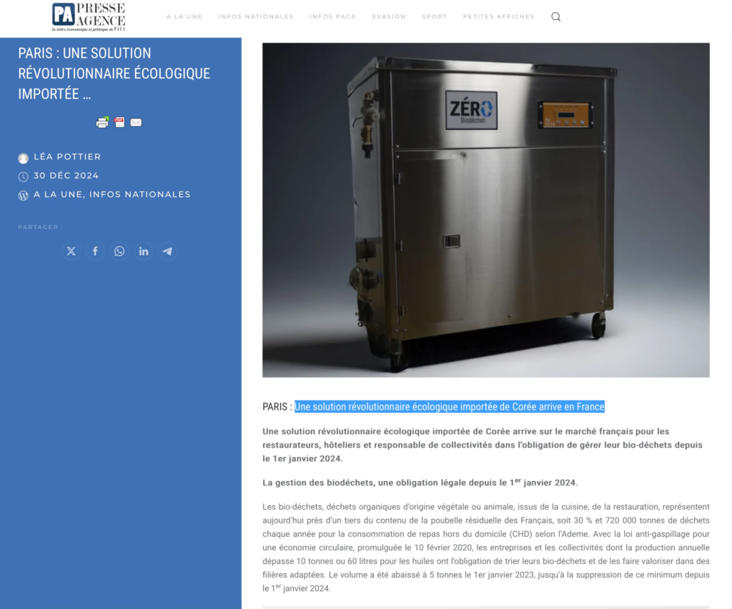 Lire la suiteZERO Biodéchet dans PA Presse Agence : Une solution révolutionnaire importée de Corée arrive en France