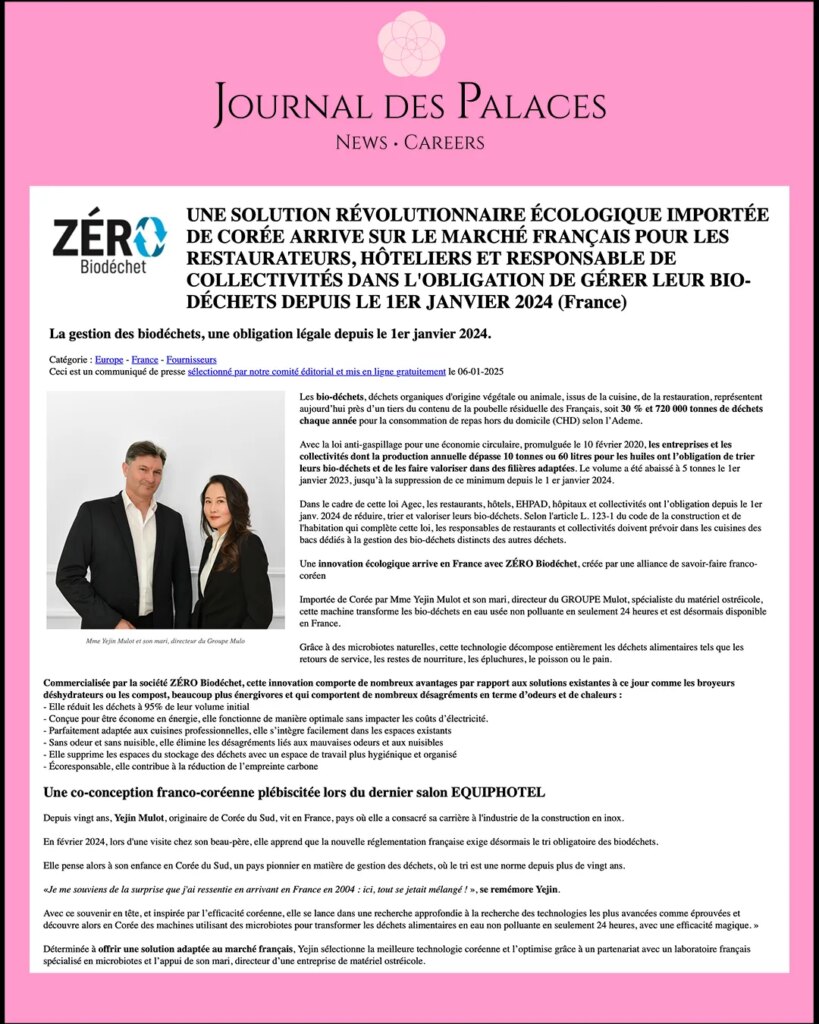 Restaurateurs, hôteliers, collectivités : êtes-vous prêts pour la nouvelle réglementation sur les biodéchets ? ♻️🇫🇷 Journal des Palaces met en lumière notre solution innovante importée de Corée, spécialement conçue pour répondre à vos besoins ! 👉 Lire l’article #Mots-clés : #Restauration #Hôtellerie #Collectivités #zerobiodechet #zerodechet #Biodéchets #Recyclage #ZéroDéchet #Innovation #Écologie #JournalDesPalaces