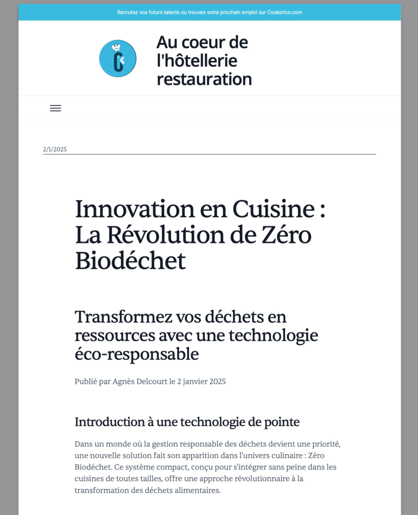 Nous sommes ravis d’être mis en avant dans le Guide CHR ! 📰 Découvrez comment ZERO Biodéchet apporte une solution révolutionnaire et écologique pour la gestion des biodéchets. 🌱✨ ✅ Traitement rapide des biodéchets✅ Réduction des coûts et de l’empreinte carbone✅ Technologie optimisée en France Merci au Guide CHR pour cet article qui met en…