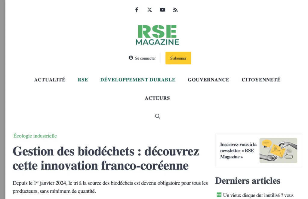 Nous sommes fiers d’être mis en avant par RSE Magazine ! 📰 Découvrez comment notre solution franco-coréennetransforme la gestion des biodéchets en un véritable levier écologique et économique. 🌱✨ ✅ Réduction des déchets à la source✅ Valorisation des biodéchets en ressources utiles✅ Technologie optimisée en collaboration avec un laboratoire français Merci à RSE Magazine pour…